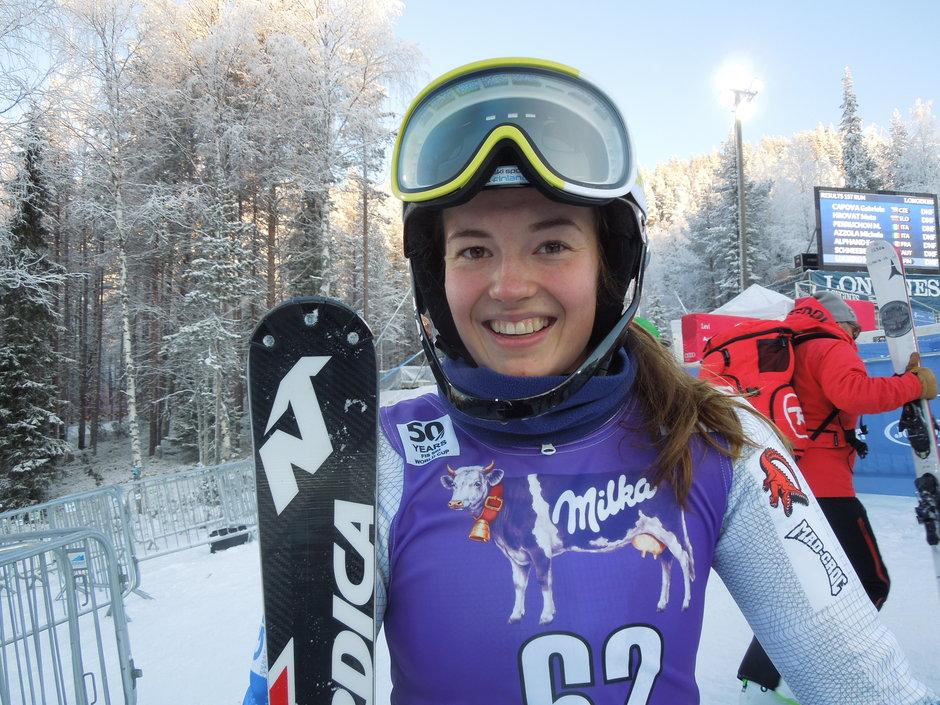 Hyvinkääläinen alppihiihtäjä Julia Toiviainen iloisella mielellä Itävallan Lanersbachissa.